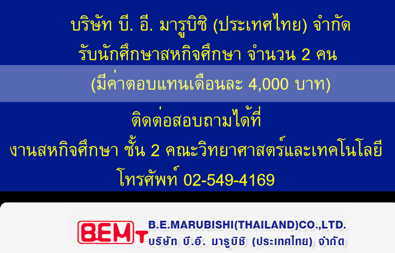 บริษัท บี. อี. มารูบิชิ (ประเทศไทย) จำกัด รับนักศึกษาสหกิจศึกษา
