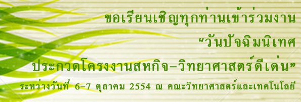 ขอเชิญทุกท่านเข้าร่วมงาน “ วันปัจฉิมนิเทศ + ประกวดโครงงานสหกิจ – วิทยาศาสตร์ดีเด่น ” ตุลาคม 5, 2011 | งานสหกิจศึกษา