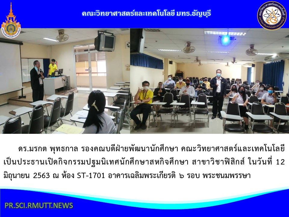 ดร.มรกต พุทธกาล รองคณบดีฝ่ายพัฒนานักศึกษา คณะวิทยาศาสตร์และเทคโนโลยี เป็นประธานเปิดกิจกรรมปฐมนิเทศนักศึกษาสหกิจศึกษา สาขาวิชาฟิสิกส์ ในวันที่ 12 มิถุนายน 2563 ณ ห้อง ST-1701 อาคารเฉลิมพระเกียรติ ๖ รอบ พระชนมพรรษา ภาพบรรยากาศเพิ่มเติม : http://www.sci.rmutt.ac.th/photo/98565